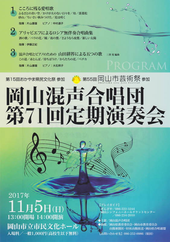 | 6月18日(日) | 岡山Chorfest2017(第70回岡山県合唱フェスティバル)へ出演(岡山シンフォニーホール) |